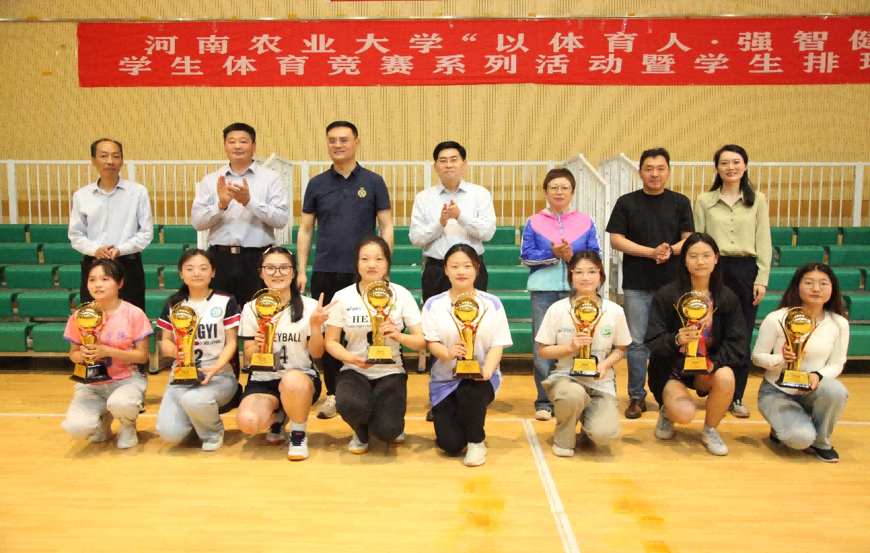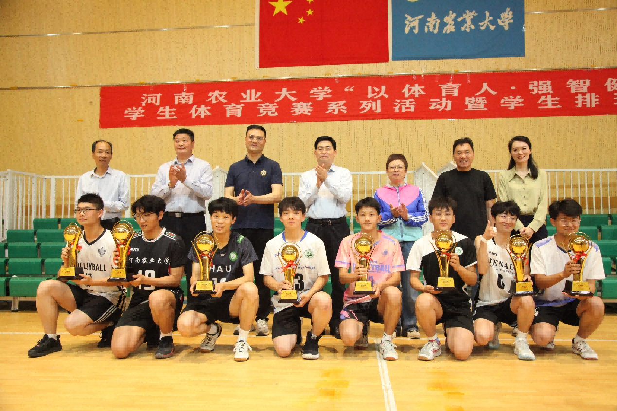 最后,获奖运动员与参加颁奖仪式的领导合影留念。此次校学生排球比赛圆满落幕。
