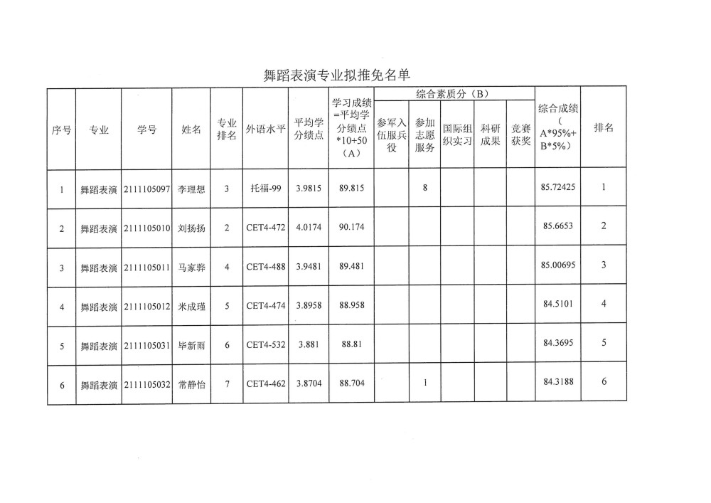 二、各专业名额:社会体育指导与管理专业7名;舞蹈表演专业6名