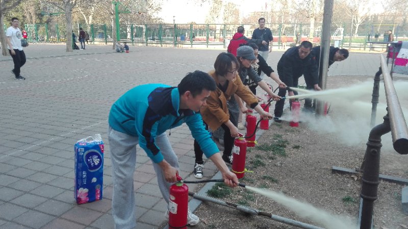 在保安人员的指导下,老师们对如何使用灭火器进行了亲手操作