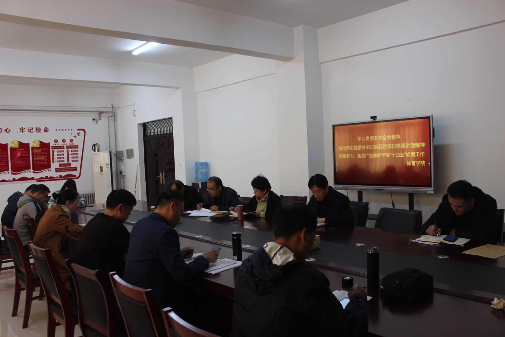 调研座谈讲话精神。大家围绕五中全会精神和魏书记调研座谈讲话精神,结合学院“十四五”规划工作就教学科研、学科建设、人才培养、社会服务、场馆建设、竞赛等方面进行了深入讨论和交流,提出了意见和建议。