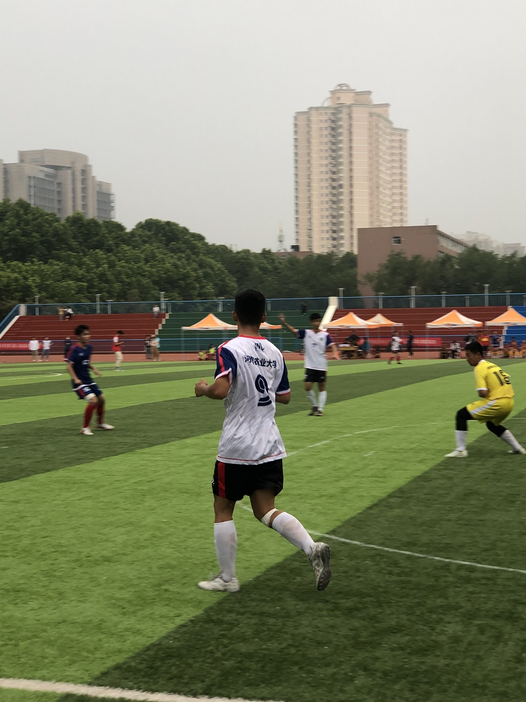 此次比赛体育专业组共17个队,小组赛中,农大体院足球队首场在上半场2:3落后对手的情况下,下半场易边再战,全面爆发接连攻入三球以5:3拿下比赛。最后一场面对实力不逊的黄河科技学院,农大体院足球队依然不屈不挠始终贯彻自己的战术打法不被对手节奏所干扰,以1:1握手言和。最终,农大体院足球队在小组赛中,以1胜2平的不败战绩成功出线,挺进八强。