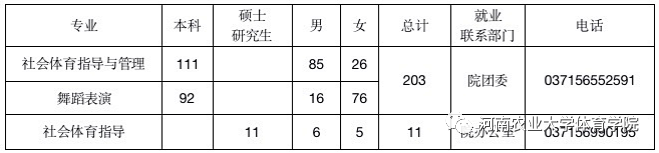 本院现有两个专业:1. 社会体育指导与管理(提前批体育类) 本专业培养具有较强的实践能力和创新意识,胜任体育健身、休闲娱乐体育指导工作,并具有体育健身、体育休闲娱乐业经营管理等、社会体育工作等能力的应用型人才。2. 舞蹈表演(艺术类专业) 本专业培养具有在体育艺术表演与训练方面具备扎实的理论知识和技能,胜任体育艺术表演的策划、编导、组织、教学、训练等工作的,具有较高体育和艺术修养的应用型人才。近年来,主持国家级、省部级科研项目45项,厅级科研项目25项,省级、校级教学改革项目11项。获河南省教学成果一等奖1项,省级教学成果5项。发表核心论文40篇,主编、参编教材27部。学院体育代表队多次参加全国、河南省大学生田径、体育舞蹈、篮球、武术、啦啦操、跆拳道等体育竞赛,取得了中国高等农业院校第九届大学生田径运动会女子团体总分第一、混合团体总分第三,全国舞蹈公开赛中L职业组冠军等好成绩。教学科研设施齐全,拥有2个体育综合训练馆、塑胶田径场、篮球、排球、网球等球类场地和人体科学实验室、图书资料室等设施。与地方体育局、健身俱乐部等20余家单位签订教学科研基地。学院以通才教育和素质教育为目标,专业氛围浓厚,第二课堂丰富多彩,学生综合素质不断提高,毕业生考研率和就业质量稳中有升,创业典型不断涌现,多次获得校学生工作先进单位、创业先进单位,郑开马拉松优秀组织单位等。