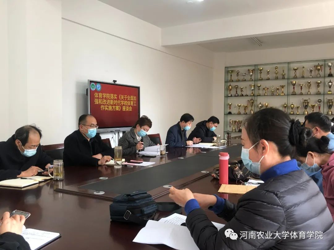 在龙子湖校区牡丹园二楼会议室组织召开会议学习研讨《关于全面加强和改进新时代学校体育工作的实施方案》,学院领导班子成员、具有高级职称的教师参加了此次会议。
