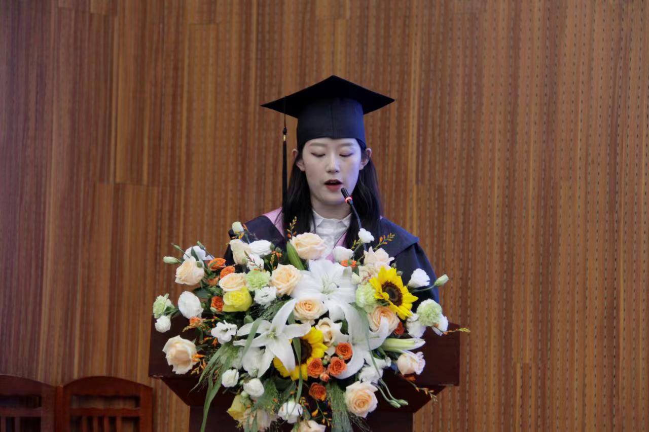 毕业生代表2018级社会体育指导与管理专业杨喻晴深情回顾了四年的大学时光。她表示,作为以农为优势特色学科的高校毕业生和新时代青年,要主动承担历史使命和时代责任,百折不挠、自强不息,做坚定的理想追求者、增强本领的奋进者、躬身实践的行动者和勇于担当的搏击者。