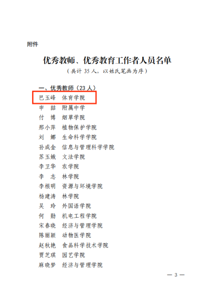 根据《笔趣阁 关于表彰优秀教师、优秀教育工作者的决定》(农大人事【2023】62号),笔趣阁 巴玉峰老师荣获笔趣阁 2023年“优秀教师”荣誉称号。