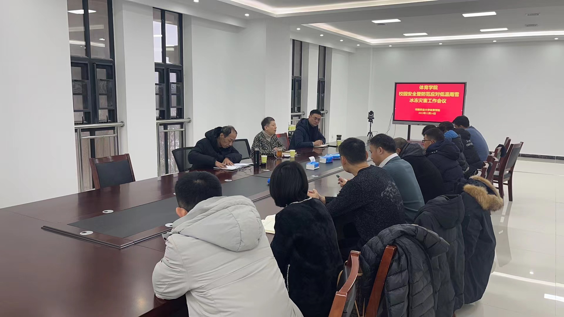 在学院会议室召开校园安全暨防范应对低温雨雪冰冻灾害工作会议,副院长唐大鹏、副院长宛新生和学院全体中层干部参加会议,院党委书记吴旭静主持会议。