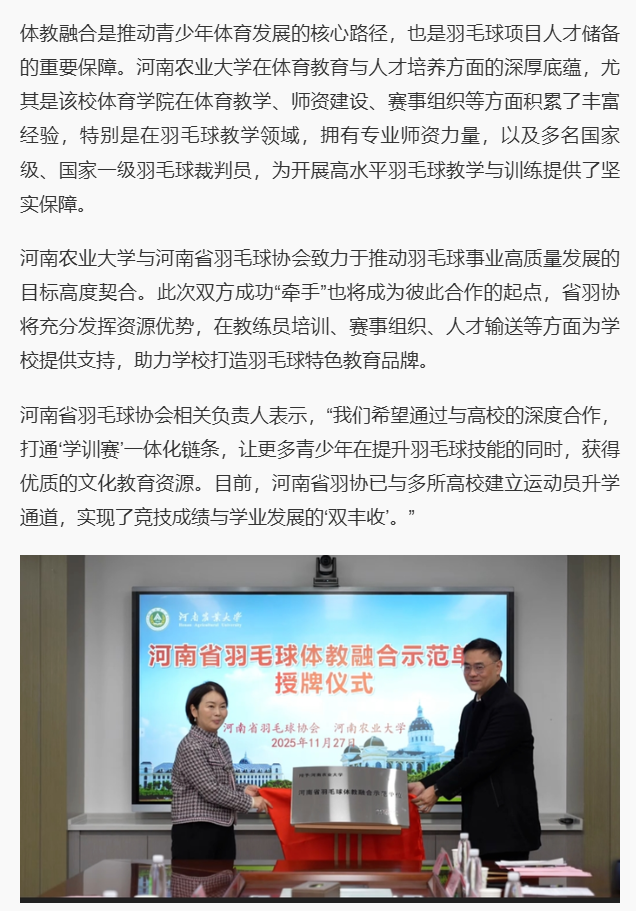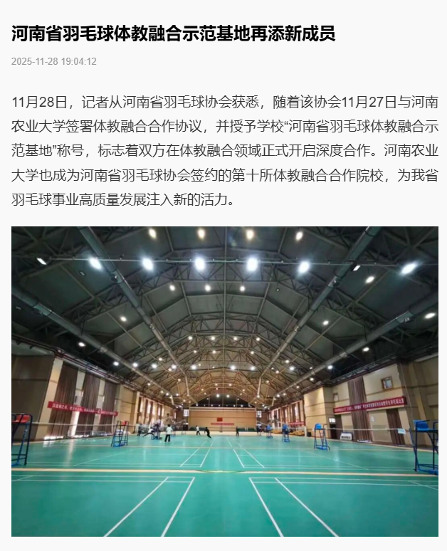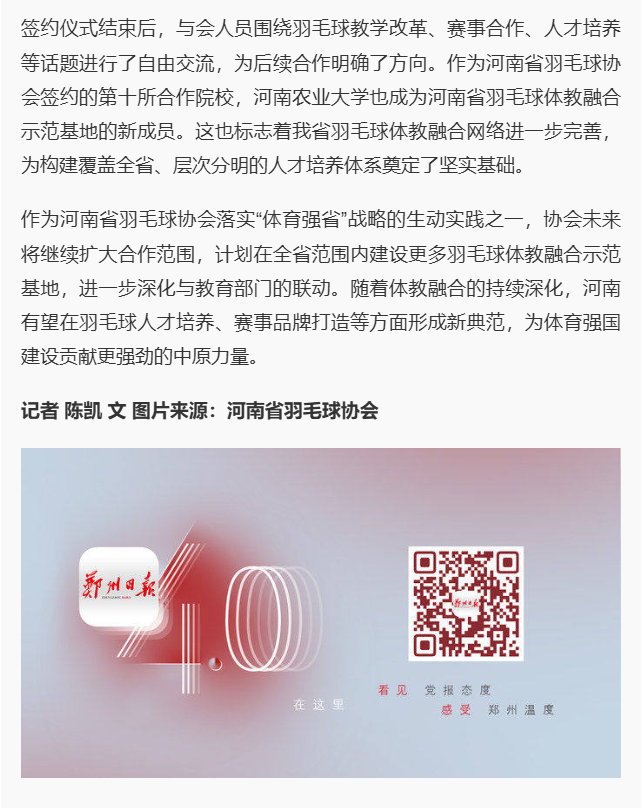 近日,《郑州日报》对我校与河南省羽毛球协会共建体教融合示范基地进行了专题报道,现将报道转载如下。