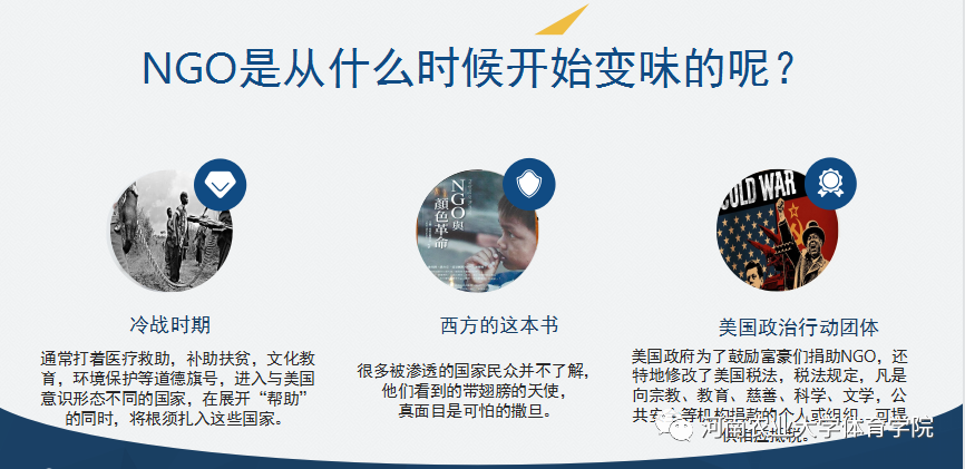 黄妍老师首先介绍了什么是NGO,并将其作为切入点引出了境外非政府组织这一概念,随后,黄妍老师通过抛出一个关于NGO是否决定一个国家的外交决策的问题来解释了起源于欧美的NGO的特征,并且分析了部分打着公益组织名号实则进行意识形态渗透的事实。